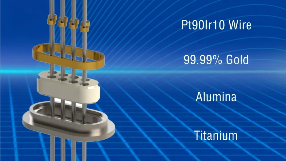 Signal-carrying pinsPlatinum-iridium, platinum, niobium, etc.Low-resistance conduction of stimulation/sensing signalsLow impedance, biocompatibility, excellent corrosion resistance